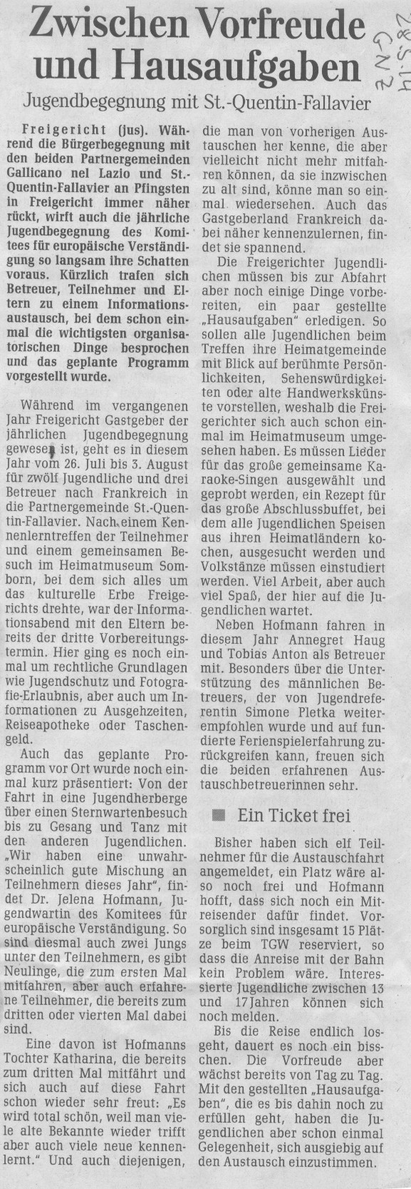 Vorbereitung der Jugendbegegnung in St-Quentin-Fallavier vom 26. Juli bis 3. August 2014