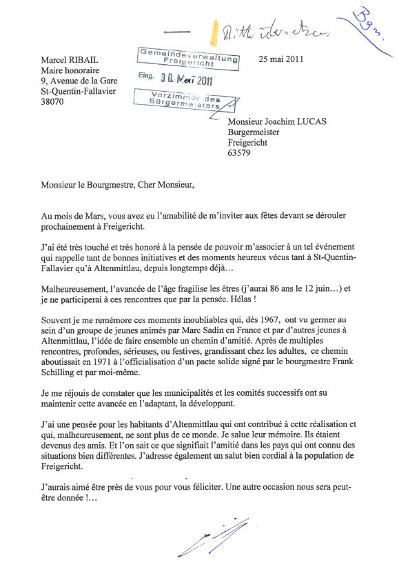 im Monat März haben Sie mich liebenswürdigerweise zu den Feierlichkeiten eingeladen, die demnächst in Freigericht stattfinden werden. Ich war sehr berührt und geehrt von dem Gedanken, an diesem Ereignis teilnehmen zu dürfen. Obwohl es schon so lange her ist, erinnert es mich am die vielen Initiativen und glücklichen Momente mit Saint-Quentin-Fallavier und Altenmittlau...