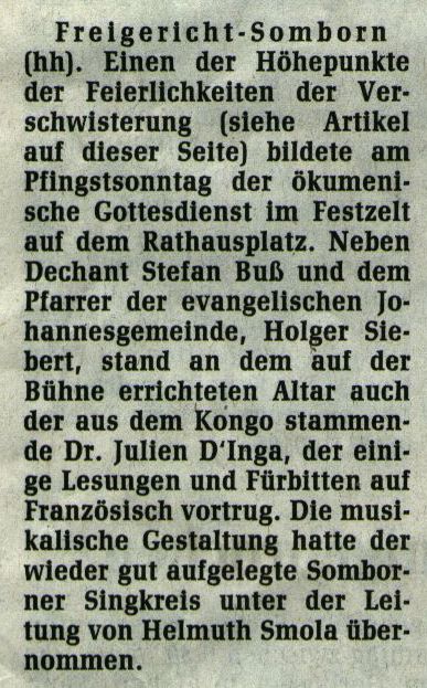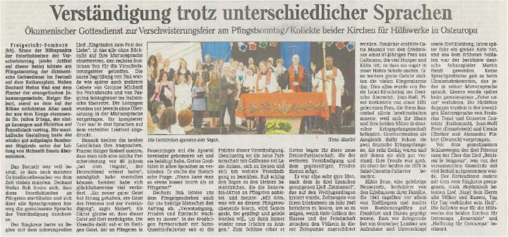 | Verständigung trotz unterschiedlicher Sprachen Ökumenischer Gottesdienst zur Verschwisterungsfeier am Pfingstsonntag / Kollekte beider Kirchen für Hilfswerke in Osteuropa