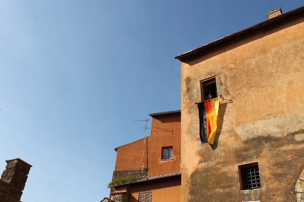 Auf dem Weg hinauf in die Altstadt zeigt und unsere Fahne den Weg und heißt uns willkommen. Beim Eintritt durch das Tor in die Stadt sind wir in Gallicano angekommen und bei Freunden.