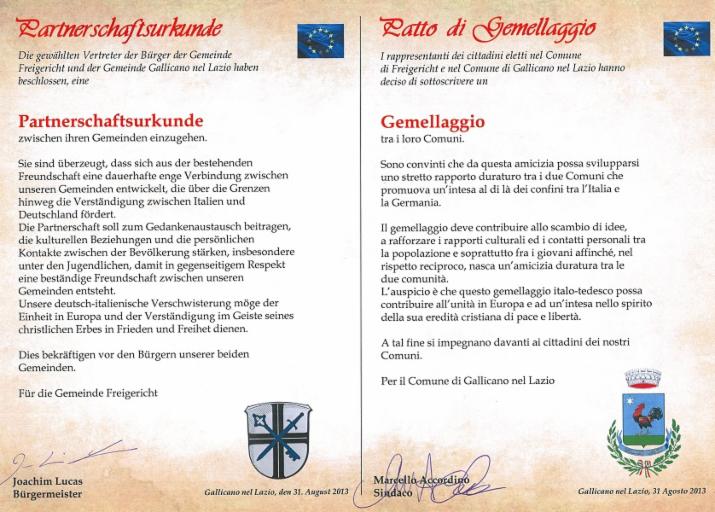 Bürgerbegegnung und Verschwisterungsfeier vom 30. August bis 2. September 2013 in Gallicano nel Lazio ![]() Die Partnerschaftsurkunde hier als PDF Fotobeiträge von JelenaImpressionen von Bernd und Irina |