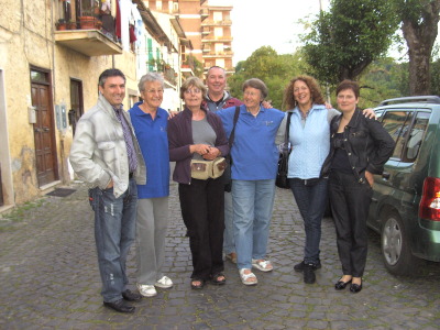 Überall ist vieles möglich – in Italien geschieht es. Wir kamen am frühen Nachmittag in Gallicano an und begannen bald einen Spaziergang durch den historischen Ortsteil. Anders, als so häufig auf Sizilien, wo die Augen das suchten was uns der Reiseführer in der Hand empfahl, entdeckten wir beim Müßiggehen sehr viel Schönes: Der Hahn am Stadttor, der „Gallus canit“, krähte uns fröhlich entgegen. Unzählige, verwinkelte Gässchen, eng aneinander gebaute Häuser mit unterschiedlichen Eingängen, schöne alte Türen – es gab so viel zu sehn. Wir bewunderten und fotografierten vor einem Haus aufgereihte Blumentöpfe. Dem freundlichen Hinweis der Besitzerin, doch auch das Heiligenfresko zu fotografieren, folgten wir gern. Die Pfarrkirche Sant' Andrea war an diesem Tag mit blauen Fähnchen nur “für uns“ geschmückt. Ja, Gallicano nel Lazio gefiel uns. Catia und ihren Mann trafen wir vor der Pension. Sehr herzliche Begrüßung, Einladung zum Aperitif in ihre Wohnung, unterwegs kurzen Plausch mit Catias Kolleginnen, Treffen eines ihrer Söhne, Austauschen der Erinnerungen an die Bürgerbegegnung in Frankreich, Bilder anschauen. Die vielen, vielen neuen Eindrücke und Empfindungen überwältigten mich. Krönender Abschluss dieses ereignisreichen Tages war das Abendessen im Restaurant Bellevue.